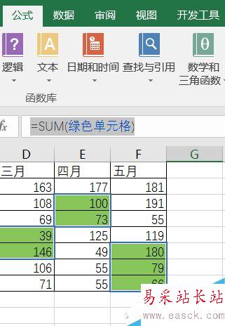 點擊確定后,隨便在一個空白單元格內輸入公式“=SUM(綠色單元格)”(不含引號)回車再看看?是不是求和已經完成了?這個公式內的“綠色單元格”就是剛才我們自己定義的名稱,根據你的需求可以自行更改哦。
