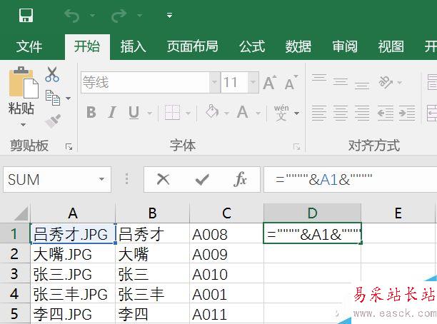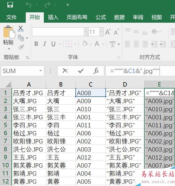 接下來在D1單元格“=""""&A1&""""”,E1單元格輸入“=""""&C1&".jpg"""”(不含兩端的雙引號),并分別點住D1和E1單元格右下角下拉覆蓋。