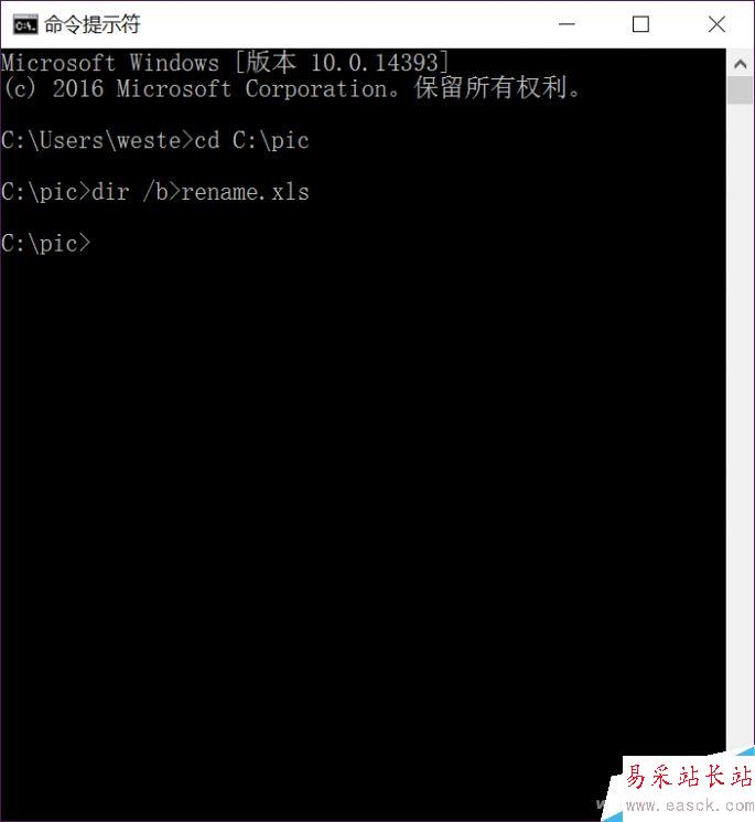 首先點擊開始菜單輸入“cmd”回車進入命令符窗口。然后切換到照片目錄,小編的例子里是C盤的pic文件夾,輸入“cd c:/pic”(不含引號)回車,然后輸入“dir /b>rename.xls”,生成一個名為rename.xls的Excel文件,并保存在照片存放目錄中。