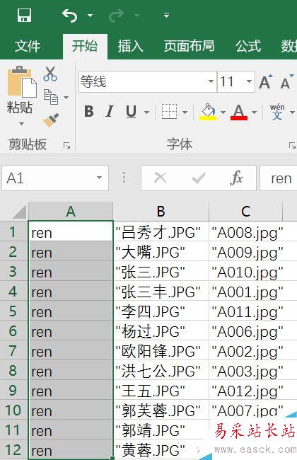 現在將A列內容清空,輸入“ren”并下拉覆蓋。