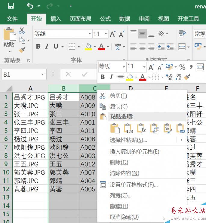 完成以上動作后,單擊D和E列然后復制,再點擊選擇B、C兩列右鍵粘貼,注意,這時候選擇“選擇性粘貼為值”(圖標上顯示123).