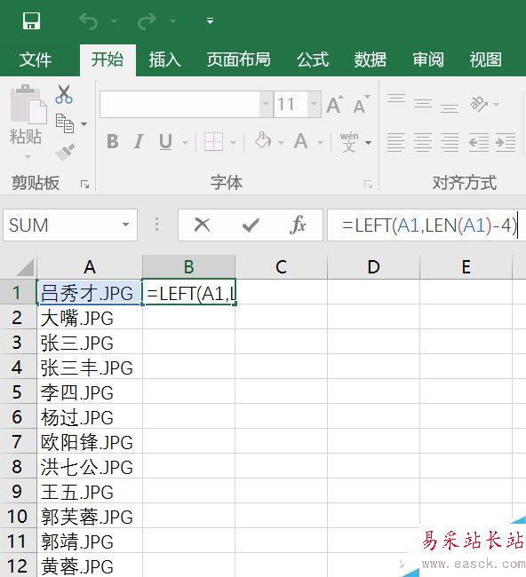 此時在B1單元格中輸入“=LEFT(A1,LEN(A1)-4)”并按住單元格右下角標下拉到文件對應的尾端。