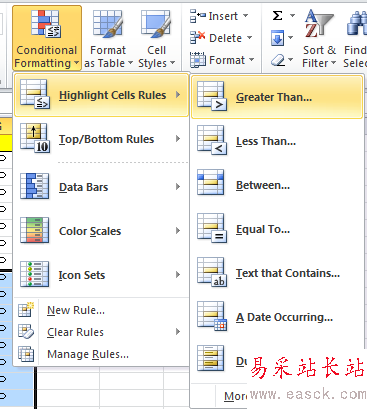 3.Hightligh Cell Rules。這里面有好多條件供我們選擇,比如我們選擇granter than