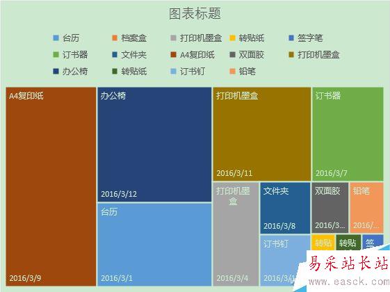 樹狀圖,按數(shù)值的大小比例進(jìn)行劃分,而且每個方格顯示不同的色彩,清晰明了。切換到“圖表工具-設(shè)計”選項卡中,還可以更改不同的樣式。