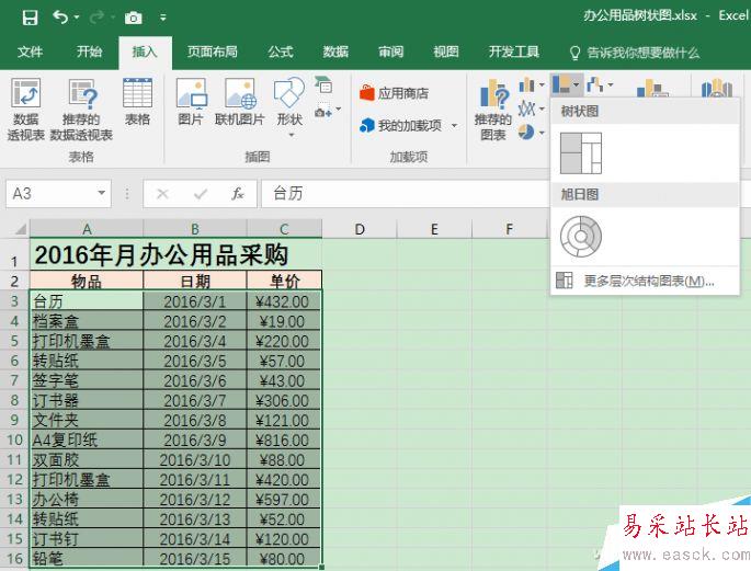 Excel的常規(guī)是處理數(shù)據(jù),不過數(shù)據(jù)最終要展示出來給大家看的,所以形象易懂非常重要。今天小編介紹Excel 2016中樹狀圖的制作,可以讓你的數(shù)據(jù)清晰明了地顯示出來。