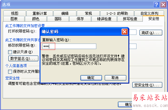 5、單擊確定,會出現一個小的“確定密碼”的對話框,在方框里重新輸入剛才設置的密碼,單擊確定。