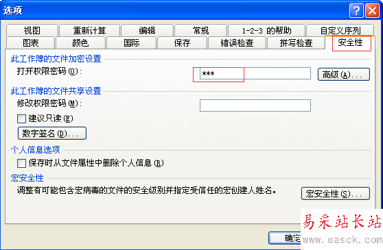 4、在“打開權限密碼”后面方框里輸入設置的密碼。