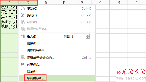 取消隱藏行或者列時(shí),需要注意一個(gè)問(wèn)題,如取消隱藏B列時(shí),至少選擇AC列,或者更多,這樣才能取消隱藏B,如果是跨列的,選擇更多,試試,熟練了,就很簡(jiǎn)單了。