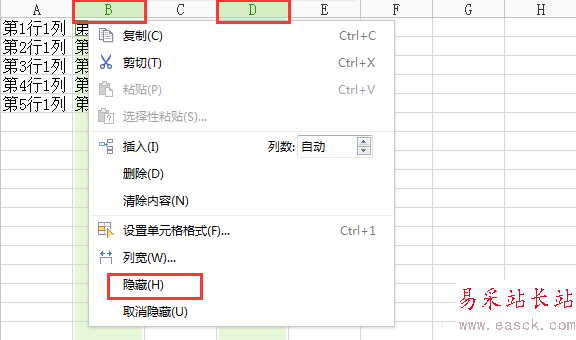 3、如果要隱藏跨列,則需要選中,此時(shí)要按住ctrl+選擇目標(biāo),然后對(duì)選擇的列或者行,右鍵,隱藏即可。