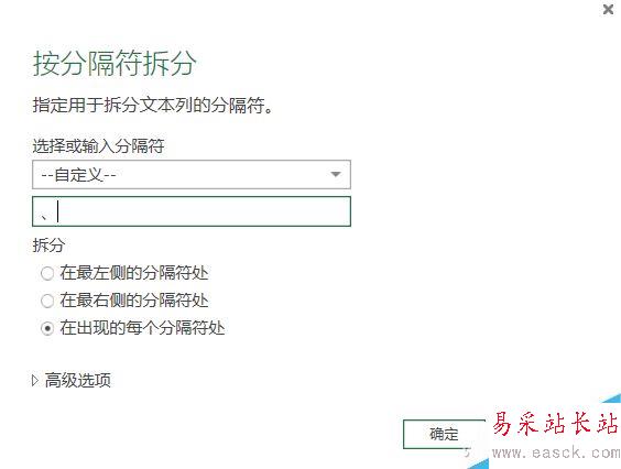 單擊“選擇或輸入分隔符”下拉選單,選中“自定義”,并輸入頓號“、”(注:本例中是人員是以頓號分割)點擊確定。