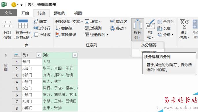 在彈出的查詢編輯器中,單擊“列2”選中,切換到“轉換”選項卡,點擊“拆分列”中的“按分隔符”。