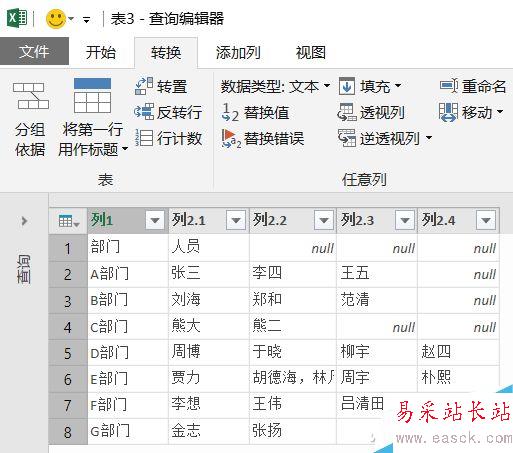 這時,查詢編輯器的數據已經變為多個列,人員名單已經獨立分拆。我們特意留了一個錯誤,列2.2的第6行是以逗號“,”分割人員,所以沒有被提取出來,所以建議大家在轉換提取時,要統一分割符號。注意,這里使用分列和在工作表中使用分列有所不同。如果需要分列的右側列中還有其他的內容,會自動擴展插入新的列,右側已有數據列自動后延。而在工作中使用分列,右側有數據時則會被覆蓋掉。
