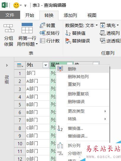 新轉換的列表已經改成以人員為基準數據的拆分方案,但是多了一列“屬性”單擊選中后右鍵選擇“刪除”。