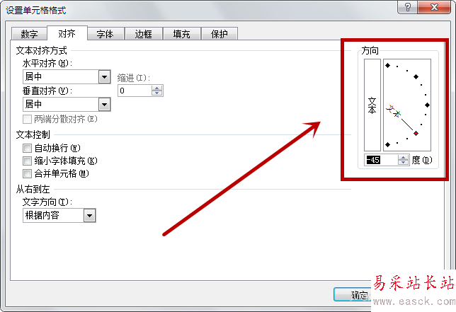 【四】可在窗體右邊“方向”調(diào)整字體傾斜的角度,調(diào)整完成后單擊確定按鈕即可。
