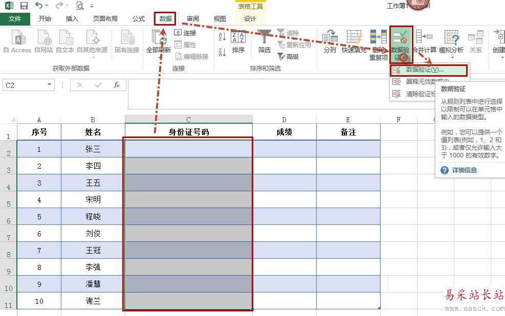 2、選中身份證需要限制的區(qū)域,單擊“數(shù)據(jù)”選項(xiàng)卡,然后單擊“數(shù)據(jù)工具”組中的“數(shù)據(jù)驗(yàn)證”(下三角),再單擊彈出菜單中“數(shù)據(jù)驗(yàn)證”。