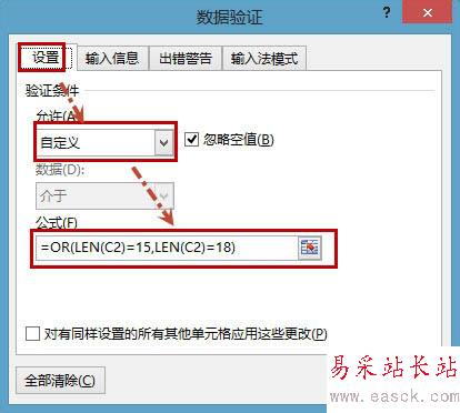3、打開(kāi)“數(shù)據(jù)驗(yàn)證”對(duì)話框,在“設(shè)置”選項(xiàng)卡中的驗(yàn)證條件,將“允許”選擇“自定義”, “公式”中輸入“=OR(LEN(C2)=15,LEN(C2)=18)”。