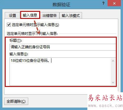 4、為了具有更好的可操作性(1):可以再單擊“輸入信息”,然后再輸入相關(guān)信息,例如在“標(biāo)題”中輸入“請(qǐng)輸入正確的身份證號(hào)”,“輸入信息”中輸入“18位或15位身份證號(hào)碼。”。
