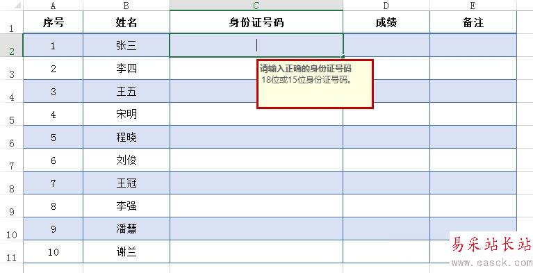 6、這時(shí)候,輸入身份證號(hào)碼的區(qū)域只能輸入18位或15位的數(shù)據(jù)了。看看效果吧!