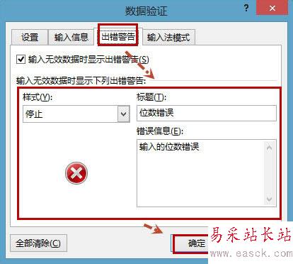 5、為了具有更好的可操作性(2):可以再單擊“出錯(cuò)警告”,然后再輸入相關(guān)信息,例如在“標(biāo)題”中輸入“位數(shù)錯(cuò)誤碼”,“錯(cuò)誤信息”中輸入“輸入的位數(shù)錯(cuò)誤”。