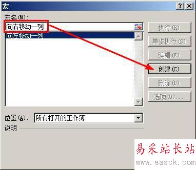 5、在宏對話框中,輸入宏名為【向右移動一列】,然后點擊創建