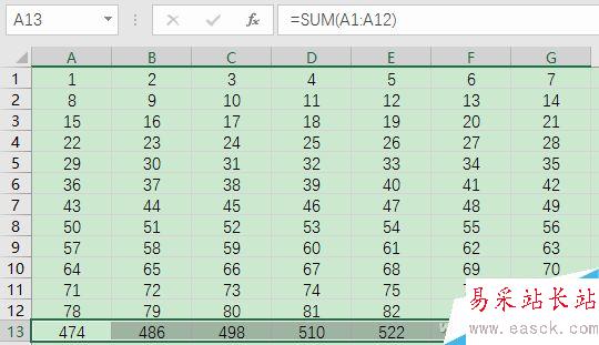 如果想同時求出每一列的數據之和,怎么辦呢?很簡單,選中所有列數據,然后還是按Alt+=鍵,將會發現,末尾一行之下,分別顯出所有列的和了。