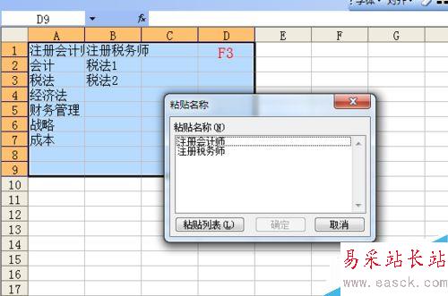 2、黏貼名稱中的全部,直接使用F3,我們也不需要使用插入,名稱,黏貼。