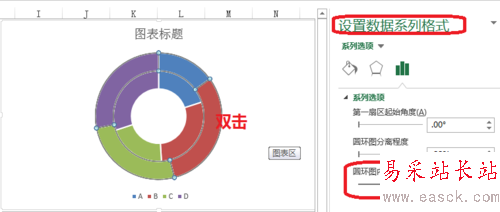 3.雙擊圓環(huán)——點擊設(shè)置數(shù)據(jù)系列格式——圓環(huán)內(nèi)徑大?。ǜ鶕?jù)需要調(diào)整)。