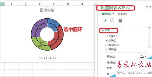 5.選中圓環(huán)——設(shè)置圖表區(qū)格式——邊框。設(shè)置邊框顏色使圖表跟明顯,容易分辨。