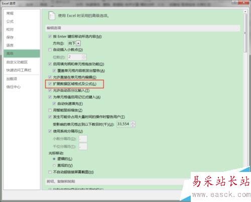 5、在右側(cè)找到“擴(kuò)展數(shù)據(jù)區(qū)域格式及公式”并勾選。