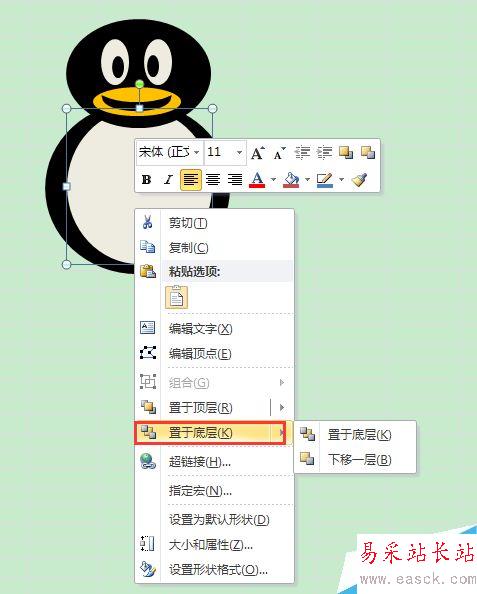 制作企鵝的身體。在工具欄【插入】里,選擇【形狀】,插入一個橢圓。調整大小。顏色填充為黑色。同樣方法再插入一個,顏色填充為白色。這樣企鵝的大肚子就做好了。注意細節。一定要把企鵝的肚子至于底層。方法:選中后,右鍵單擊,選擇至于底層。進行微調
