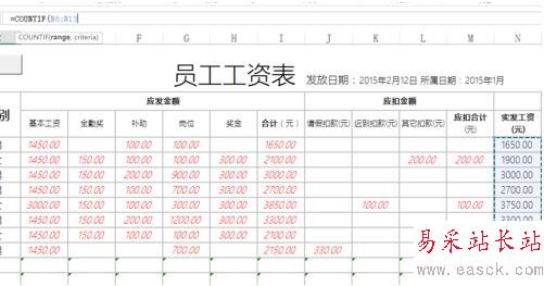 2.需要統(tǒng)計(jì)實(shí)發(fā)工資大于3000的人數(shù),就可以使用countif函數(shù)來獲取。首先選擇判斷的區(qū)域。如圖所示: