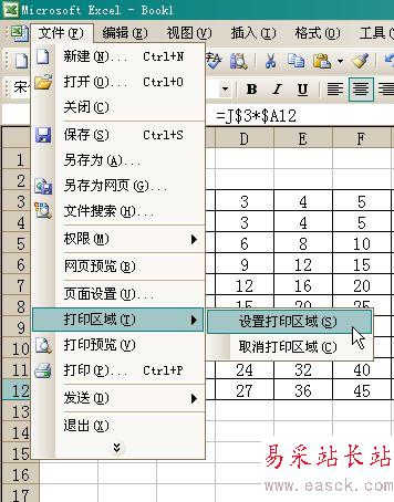 3、然后依次點擊菜單:“文件”-“打印區域”-“設置打印區域”,如下圖:
