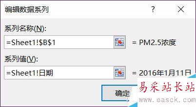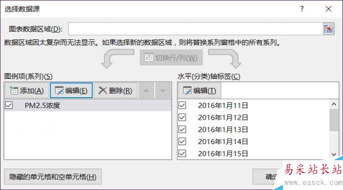 在選擇數據源中分別編輯左側圖列項(系列)和水平(分類)軸標簽,分別對應之前修改自定義名稱(日期、數據)。
