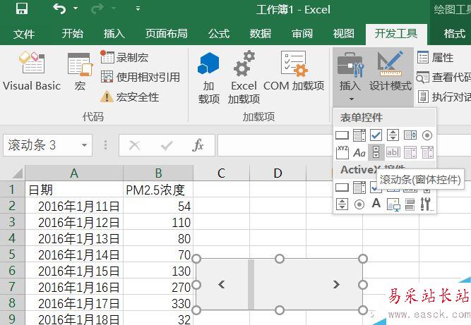 打開Excel,在要制作成動態數據表格的頁面上切換選項卡到開發工具(如沒有開發工具,請點擊Excel文件—選項—自定義功能區,右側勾選開發工具即可),選擇“插入”表單控件中的滾動條。