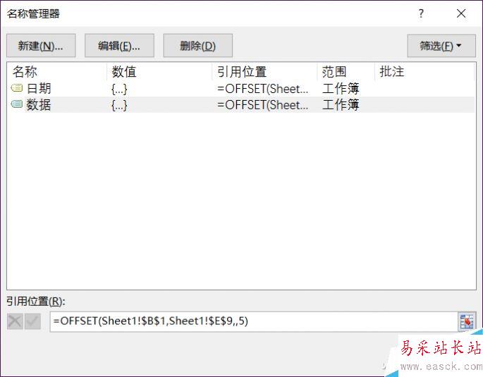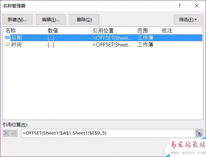 這時,按下Ctrl+F3打開名稱管理器,這里略復雜,彈出的窗口是新建自定義名稱,第一個比如叫日期,就輸入
