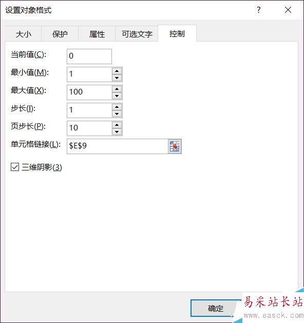 切換選項卡到“控制”一項,修改單元格鏈接,比如我們選中的是E9這個空白單元格(點擊單元格鏈接后的小圖標可以直接選擇單元格)。
