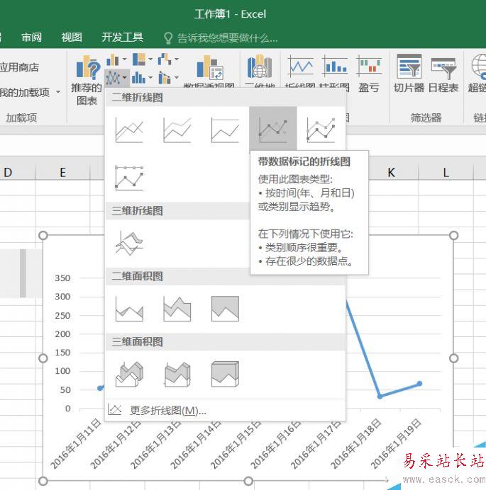 現在開始制作圖表,在Excel界面選擇“插入”選項卡,找到折線圖的小圖標(在推薦的圖表附近),點擊選擇一個折線圖。