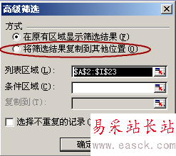4、彈出一個高級篩選對話框,你可以選在原有區域顯示篩選結果,這樣就會在原來的數據位置把重復記錄刪除。我更推薦你選將篩選結果復制到其他位置,這樣會保留原來那張表