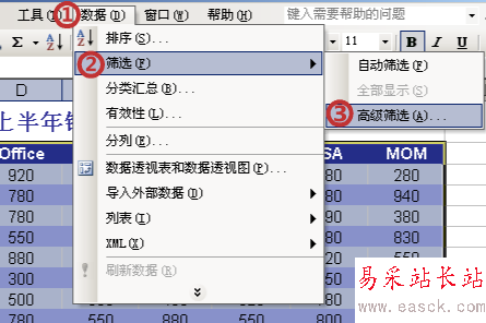 3、數據菜單-> 篩選 -> 高級篩選