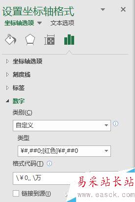 在右側(cè)打開的坐標(biāo)軸格式窗口中,展開“數(shù)字”項(xiàng),將“類別”設(shè)置為“自定義”,在格式代碼框中輸入“/¥0,, /萬”。在自定義格式中,需要加入說明性字符的部分,可以先輸入斜杠再輸入相應(yīng)字符,比如本例中的“/¥”和“/萬”,字符可以根據(jù)實(shí)際情況自行決定。科學(xué)計(jì)數(shù)中,每3位數(shù)就有一個(gè)逗號(hào)分節(jié)符,在這個(gè)自定義格式中,分節(jié)符越多,數(shù)字就越短。