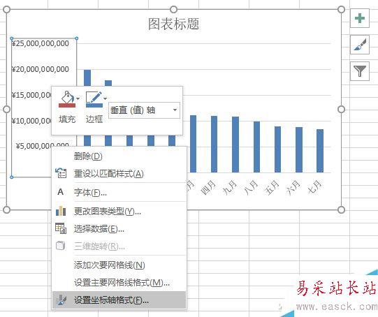 有些圖標(biāo)的Y軸標(biāo)簽數(shù)字太長,不但影響閱讀,也不美觀,這時(shí)可以想辦法縮短Y軸的標(biāo)簽。在Y軸的標(biāo)簽上右擊,然后選擇“設(shè)置坐標(biāo)軸格式”。
