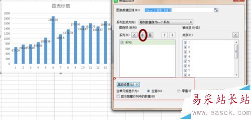 5、接著選中圖表,執行“圖表工具——選擇數據”,會彈出對話框,這里可以進行添加系列,另外在高級設置中可以選擇對于空白系列的處理,設置好之后點擊確定即可,這樣數據標簽就設置好了。