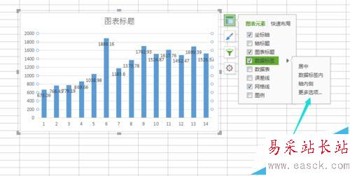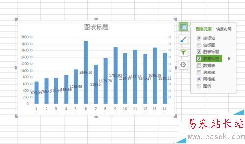 3、然后我們單擊圖表,在圖表的右側胡出現一系列的圖標小功能,我們點擊圖表元素,在下列選項中點擊勾選“數據標簽”,這樣圖表就會準確顯示出數據,如圖