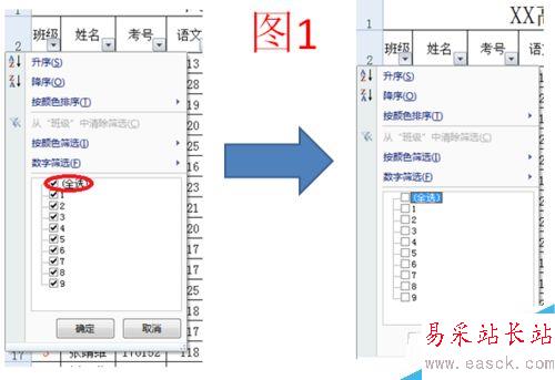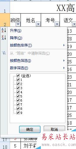 第五步:選擇篩選對象。以篩“選班”級為例。本工作表共有9個班級,一般的默認都是全部顯示。