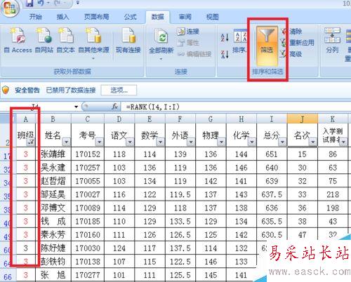 第七步:其他目標數據篩選方法同“班級”篩選。如果需要把篩選的成績返回到最初的樣式(即所有9個班的成績),再次點擊“數據”下方“篩選”選項即可。(如下圖)