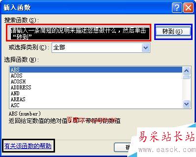 3、“有關(guān)該函數(shù)的幫助”如圖藍(lán)色方框包圍的部分,點(diǎn)擊打開后,就會(huì)顯示我們選擇的“選擇函數(shù)”里面的函數(shù)的使用的相關(guān)說明,具體函數(shù)的使用可以通過這里來查看,在下面第3步中,我們將詳細(xì)分析一下關(guān)于函數(shù)使用幫助頁面的內(nèi)容。