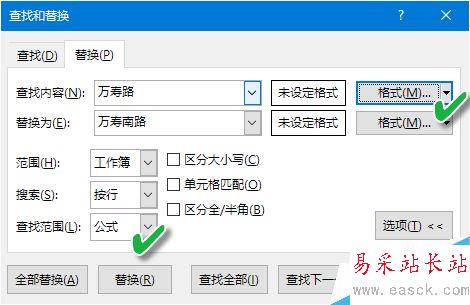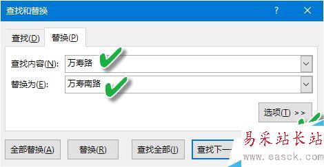 在文本框內分別輸入查找內容“萬壽路”和替換內容“萬壽南路”,單擊“選項”按鈕打開查找和替換的詳細選項。