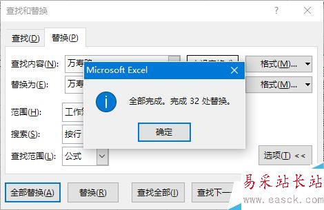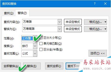 在詳細替換窗口中,將“范圍”選擇從默認的“工作表”改為“工作簿”,單擊“全部替換”按鈕。