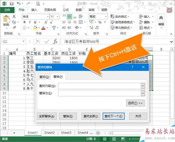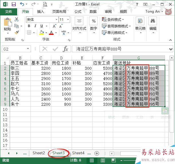 用個例子說話:下面的這個Excel工作簿是向員工發放工資通知的原始表集合,Sheet1到Sheet4從分別保存4個不同部門的員工記錄,這些員工均住在“萬壽南路”,但由于錄入人員的疏忽,統統都輸成了萬壽路,雖然缺少一個字,但所有表格的地址都錯了。現在需要快速地將所有表中的“萬壽路”前加一個“南”,如何實現快速添加?
