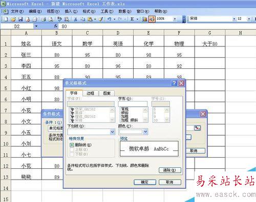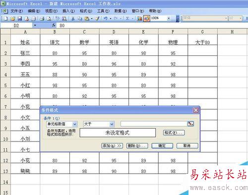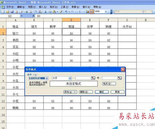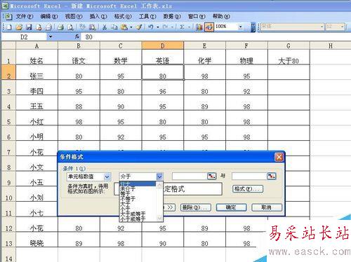 3、單擊“條件格式”按鈕后會彈出如圖對話框,這時我們單擊“介于”后方的小倒三角形。